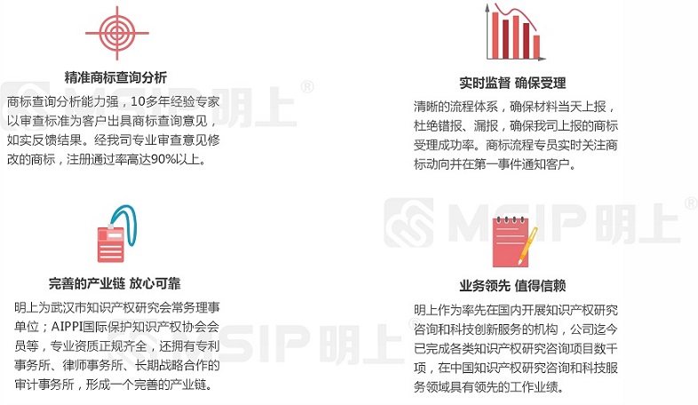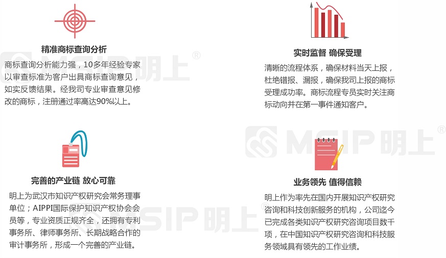 1、專業(yè)知識(shí)產(chǎn)權(quán)背景 明上利用自己專業(yè)化的知識(shí)產(chǎn)權(quán)背景,為企業(yè)知識(shí)產(chǎn)權(quán)領(lǐng)域業(yè)務(wù)提供專業(yè)解決、代理申報(bào)服務(wù)并完善申報(bào)工作中關(guān)于企業(yè)自主知識(shí)產(chǎn)權(quán)的專業(yè)問題。